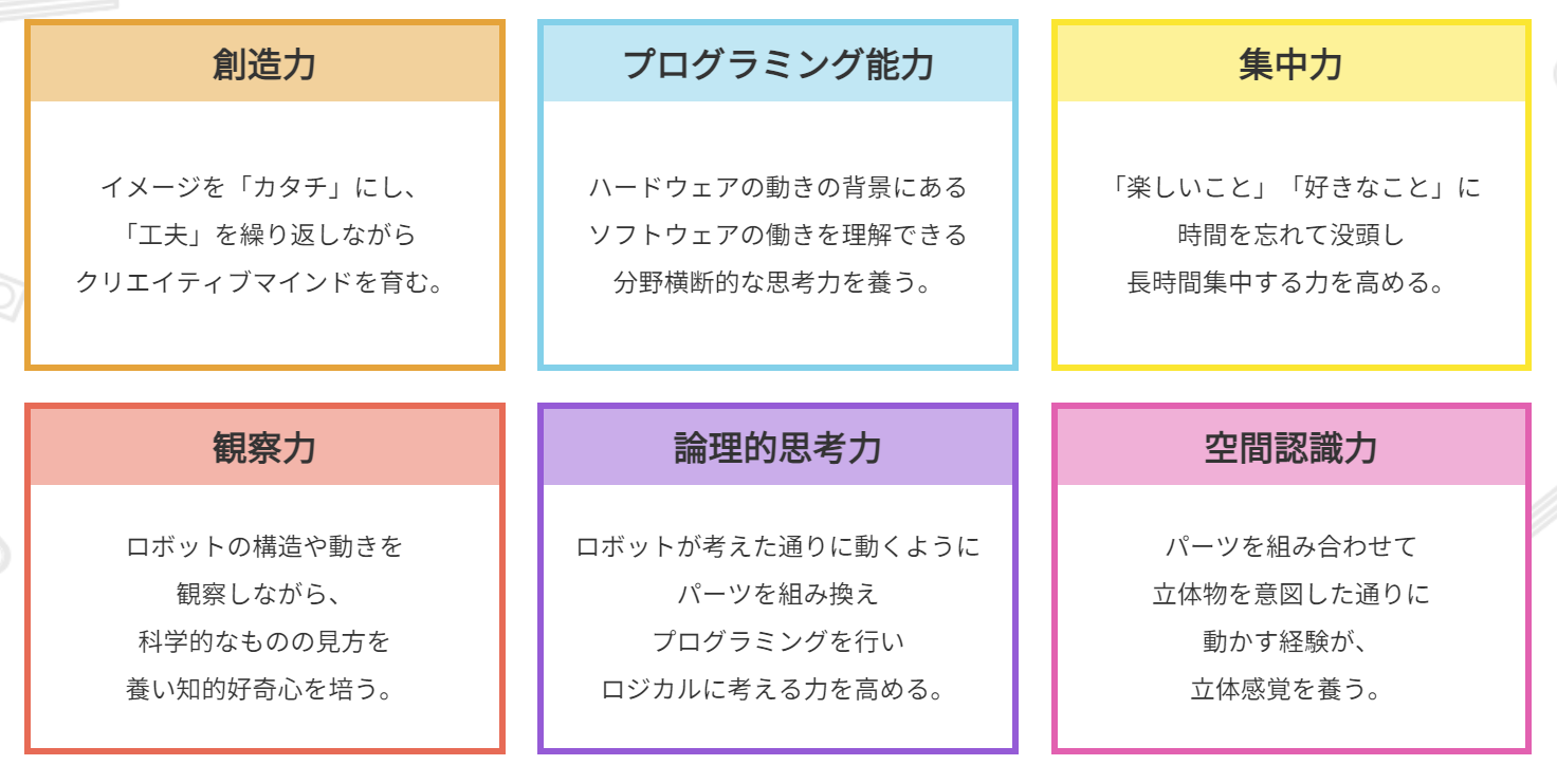「楽しみながら学ぶ」を通じて、ロボット教室では主に以下の6つの力を育てていきます。